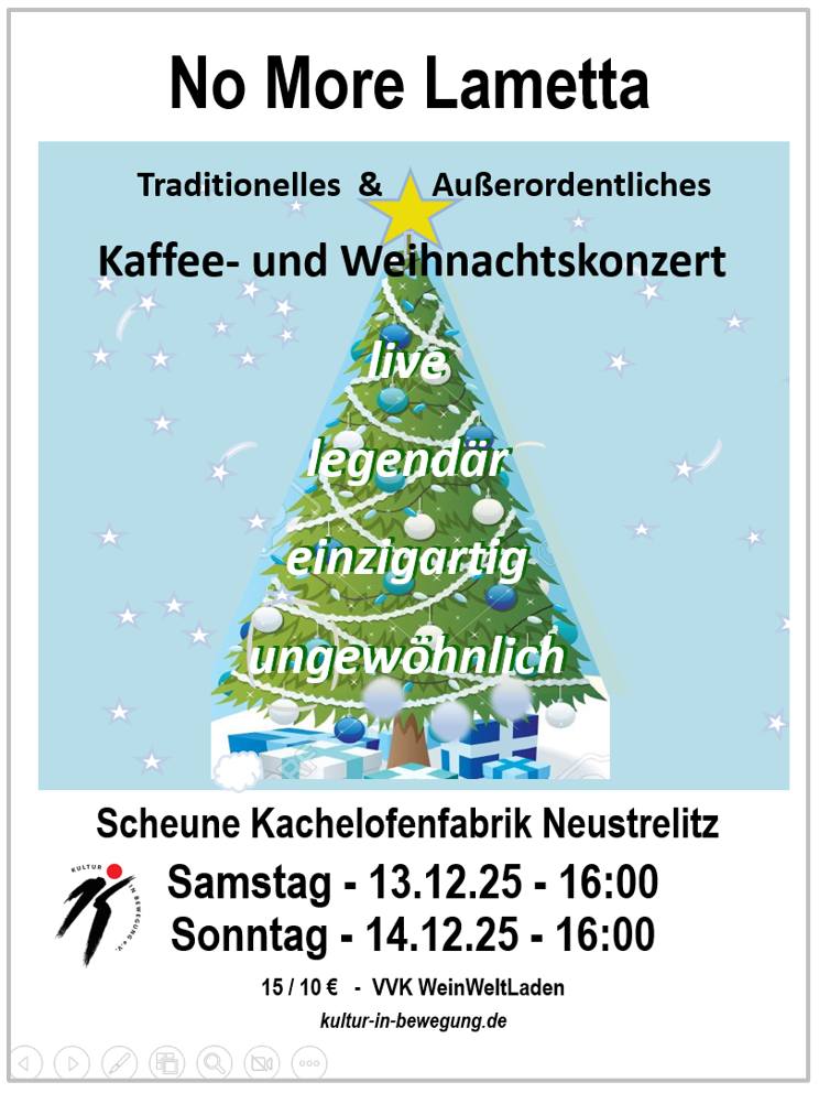 Auf Einladung von "Kultur in Bewegung" e.V. und mit Unterstützung der Kachelofenfabrik wird das hören- und sehenswerte Programm traditionell zum 3. Advent an zwei Terminen in der Scheune der Kachelofenfabrik Neustrelitz aufgeführt - am Samstag, 13.12., und am Sonntag, 14.12., jeweils um 16:00 Uhr.